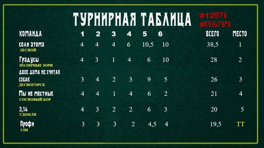 Команда "Атомный "Извилинг" опубликовала турнирную таблицу онлайн-викторины на тему "КУЛЬТУРА"