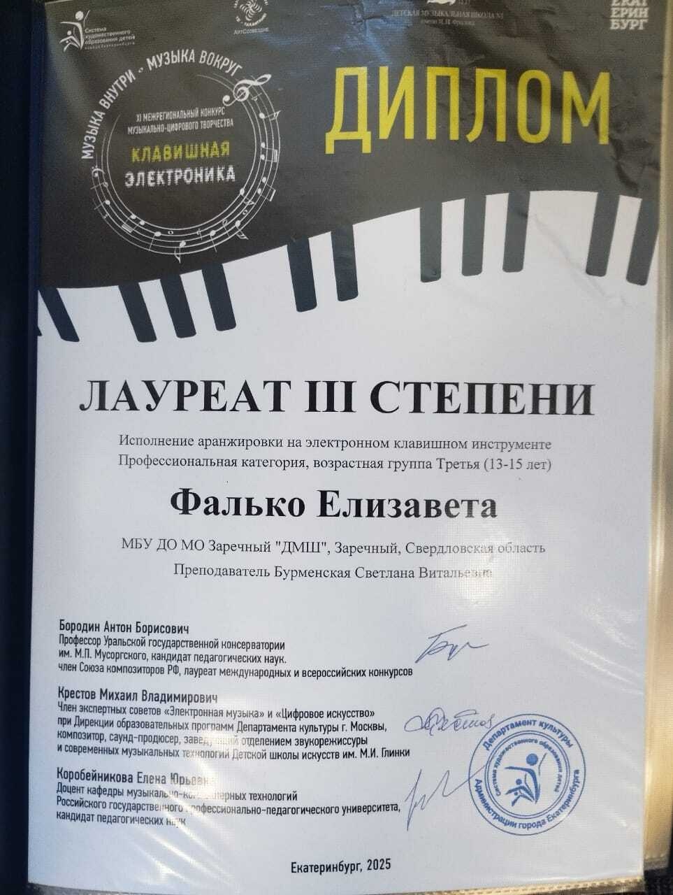 Воспитанница детской музыкальной школы Заречного Свердловской области Елизавета Фалько получила звание лауреата III степени, продемонстрировав высокий уровень мастерства и творчества.