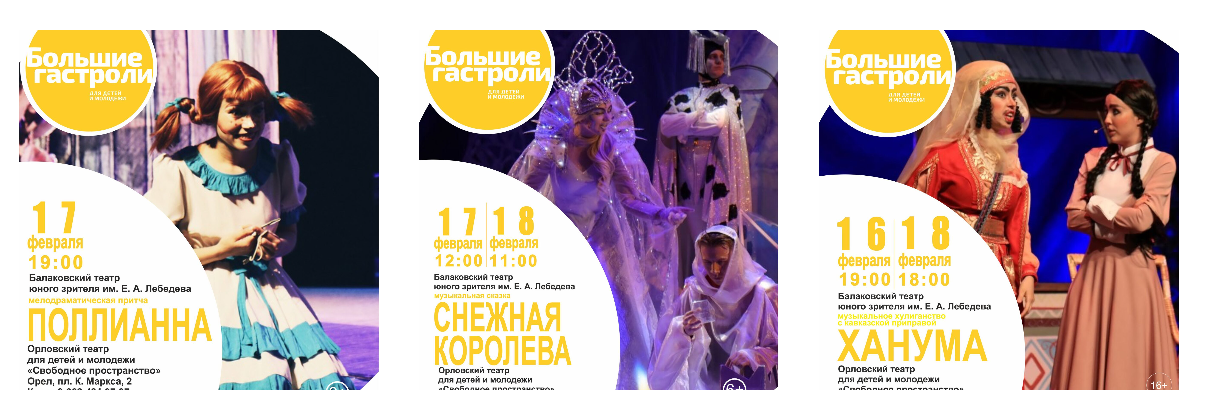 С 16 по 18 февраля состоялись гастроли Балаковского ТЮЗа им. Е.А. Лебедева в Орле. На сцене Государственного театра для детей и молодежи «Свободное пространство» прошли спектакли «Поллианна», «Снежная королева», «Ханума».